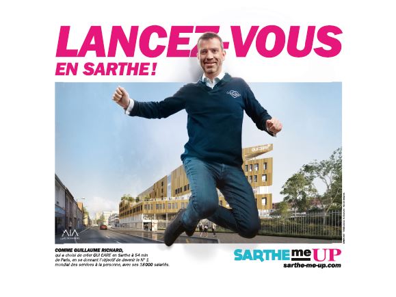 Jusqu’au 30 août, le département de la Sarthe s’affiche dans le métro parisien pour une campagne d’attractivité baptisée « Lancez-vous ! ». Les visuels qui mettent en scène 6 ambassadeurs (dont Guillaume Richard, PDG Fondateur de Oui Care) ont pour but d’attirer de futur(e)s Sarthois(e)s à s’installer, pour vivre, travailler, télétravailler, investir, entreprendre, construire… dans le département (photos réalisées par le Sarthois Nicolas Boutruche). Les témoignages vidéo des ambassadeurs sont également à retrouver sur le web et les réseaux sociaux (films réalisés par l’agence Numéro 7). La campagne a été orchestrée par l’agence Nantaise LMWR.
