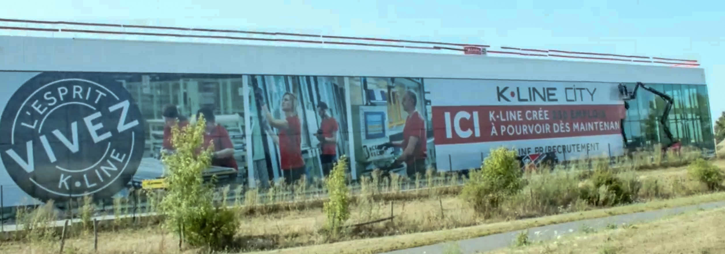 L’agence DL System a imprimé un message de recrutement de 500 m² sur la nouvelle usine de K-Line, en construction aux Herbiers (85), annonçant 250 emplois à pourvoir. Ainsi qu’une autre affiche sur un site voisin du fabricant de portes et fenêtres.