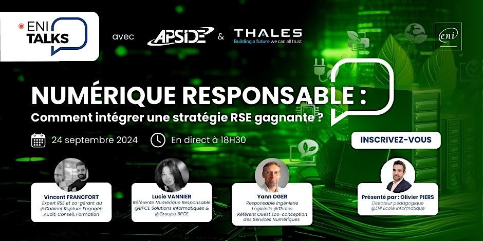 - en présentiel : places limitées ! Cocktail apéritif de prévu après le ENI Talks pour échanger, débriefer, réseauter.