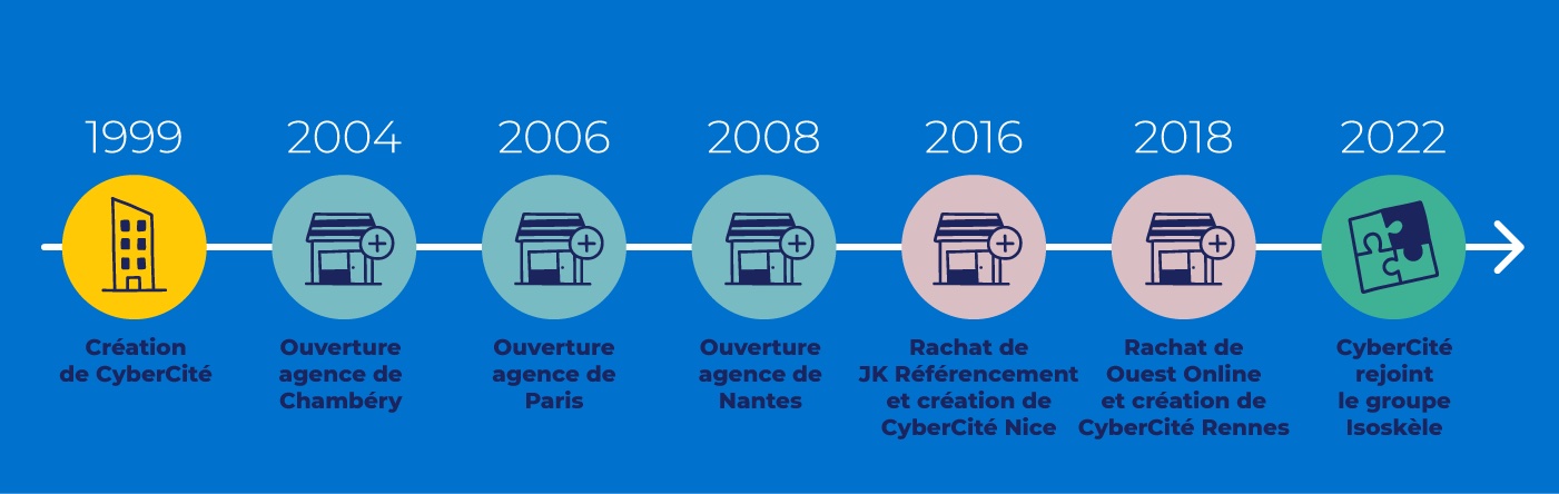 Tout commence en 1999, à Lyon, quand CyberCité voit le jour. L’agence se donne comme mission d’être experte en Marketing Digital et d’accompagner des clients dans l’élaboration et la mise en place de stratégies d’acquisition d’audiences et de génération de business, en alliant tactique, engagement et performance.