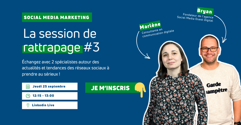 Marlène et Bryan, de l’agence spécialiste des réseaux sociaux Ouest Digital, vous donnent rendez-vous le 25 septembre en live sur Linkedin pour la 3ᵉ édition de « La Session de Rattrapage » !
