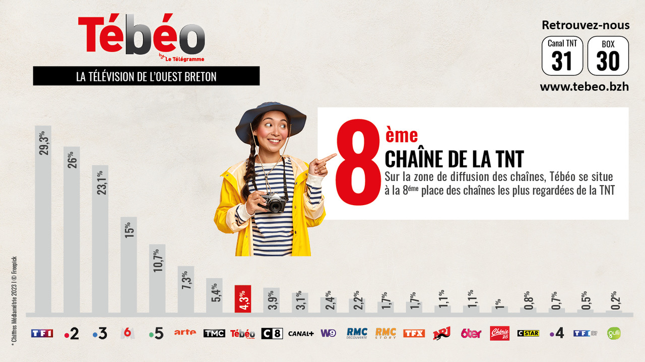 La chaîne locale Tébéo a battu tous ses records. Selon une étude Médiamétrie, elle a multiplié par deux sa durée d’écoute et se place au 8e rang des chaînes de la TNT sur son territoire. Plus d’un tiers des Finistériens la regardent.