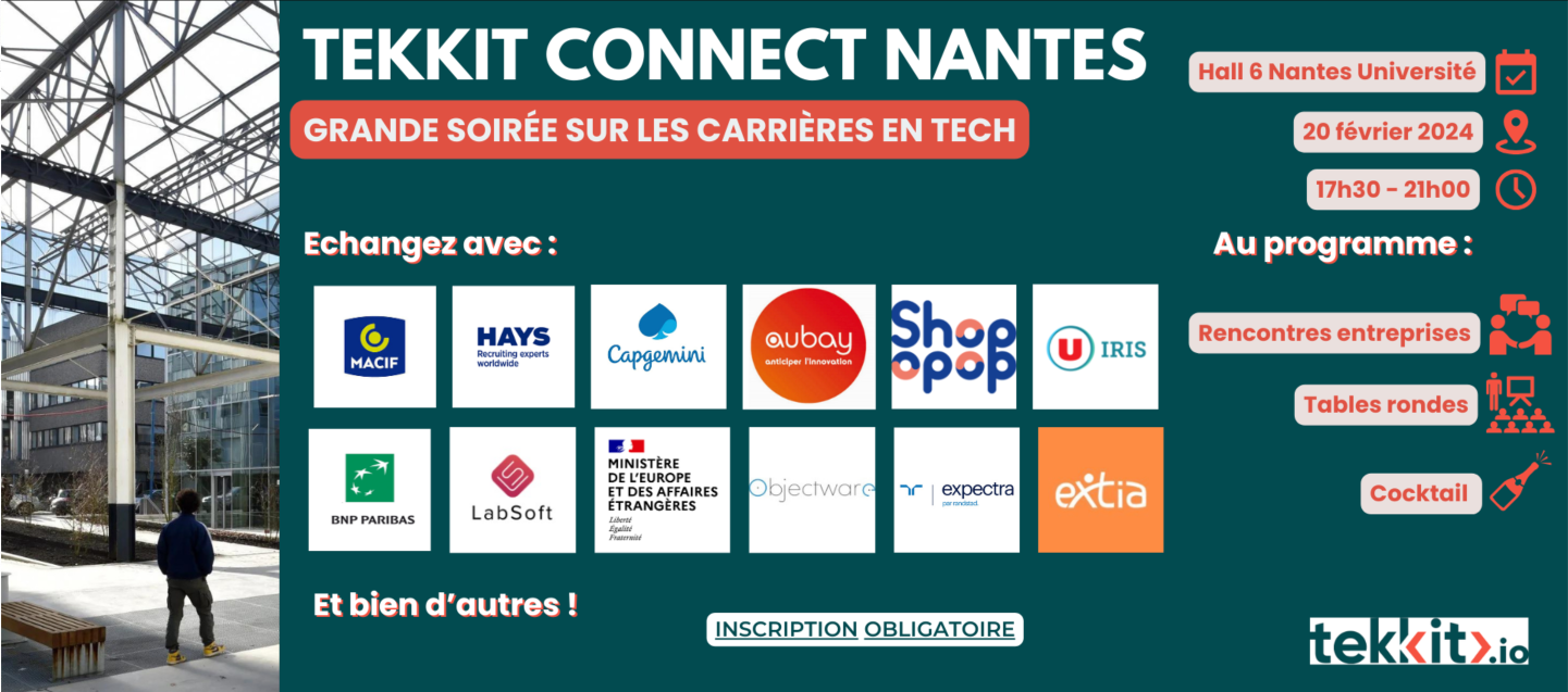 Tekkit organise à Nantes la grande soirée dédiée aux carrières de la Tech ; et plus spécialement aux carrières dans les domaines du Développement, de la Data, du DevOps, des Systèmes & Réseaux, de la Cybersécurité, de la QA et du Product.